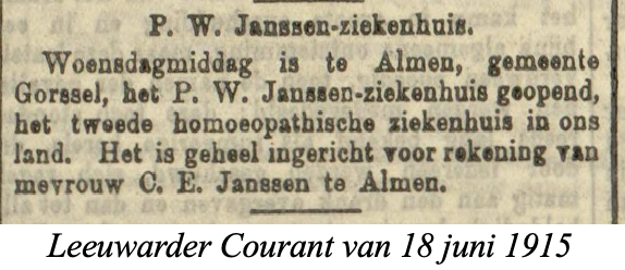 Zelfs de Leeuwarder Courant maakte melding van de opening van het “tweede homeopathische ziekenhuis in ons land” – en dat nog wel in Almen. Daar woonde huisarts en homeopaat Van der Harst, die zich jarenlang had ingezet voor zo’n ziekenhuis. Maar de spil van het geheel was Clara Elisabeth Janssen, die met haar erfenis de bouw mogelijk maakte.