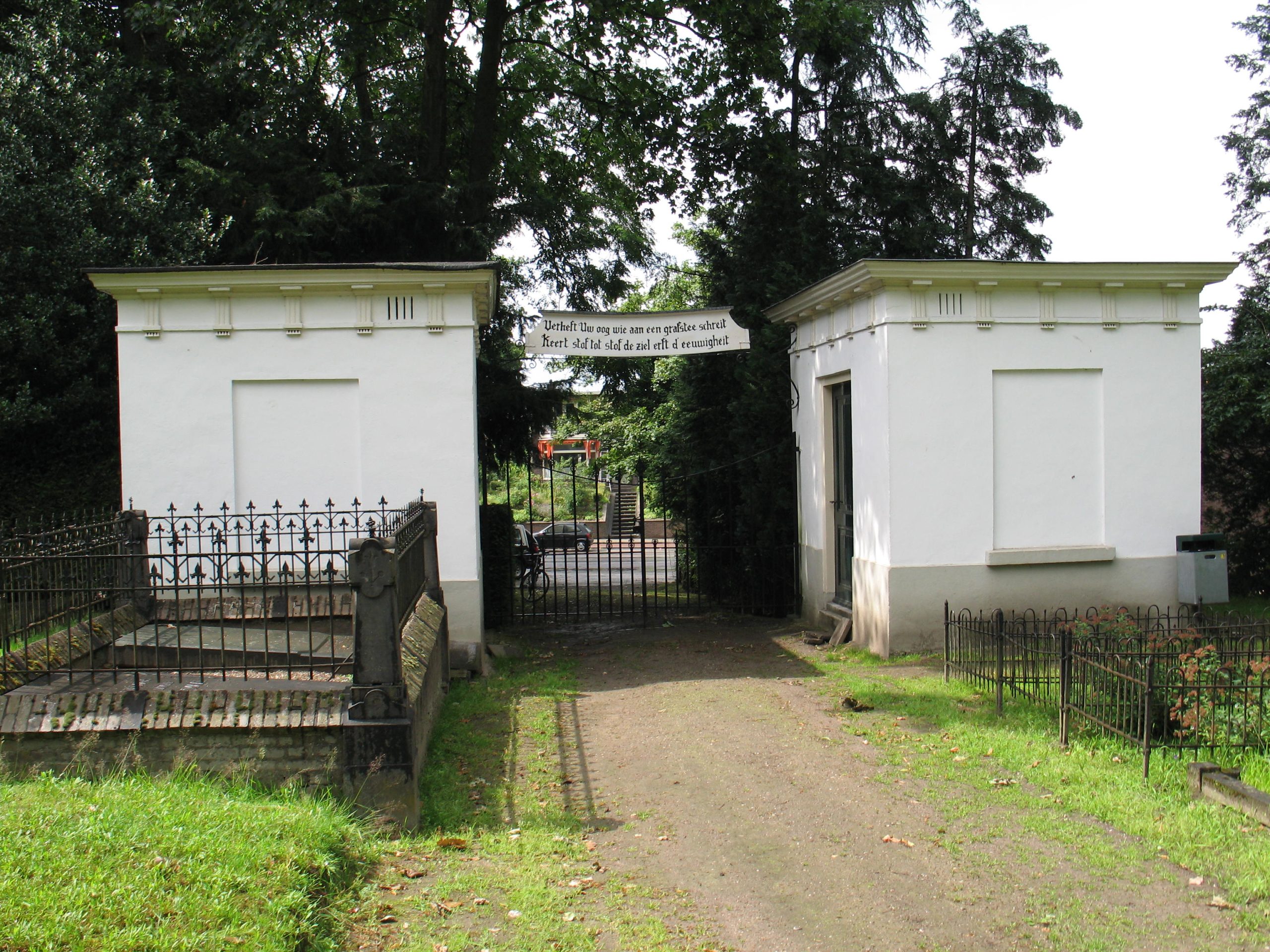 Nadat eind jaren twintig van de negentiende eeuw bij wet werd verboden om de doden nog langer bij te zetten in stads- of dorpskerken en de daaromheen liggende kerkhoven, werd ook in Lochem een nieuw terrein buiten de bebouwde kom ingericht als dodenakker. De nieuwe begraafplaats werd in 1830 geopend. De entreepartij, bestaande uit twee vierkante gebouwtjes in neoclassicistische stijl, is vermoedelijk enkele jaren later gerealiseerd. Al bij de opening van het terrein werd de dichter mr. A.C.W. Staring door de toenmalige burgemeester van Lochem, H.J. Thomasson, benaderd om een passende spreuk te bedenken, die boven ingang kon worden aangebracht. Op het houten tekstbord, dat met smeedijzeren beugels aan de entreegebouwtjes is bevestigd, is de tekst van Staring nog steeds te lezen: ‘Geen afschrik bare U wat gij ziet, Den dood vreest hij die God vreest niet”. Op de achterzijde van het bord gaat Staring verder: “Verheft Uw oog wie aan een grafstee schreit, Keert stof tot stof de ziel erft d’eeuwigheit”.