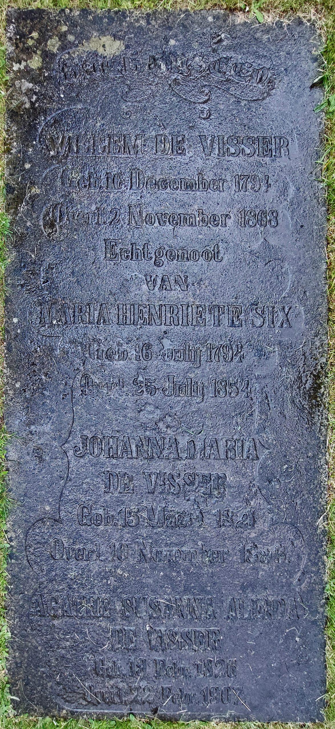 Bij binnenkomst van de Oude Begraafplaats is aan de rechterhand, direct achter het graf van burgemeester Thomasson een grafsteen te vinden, waarop nauwelijks iets te lezen valt. Hier is begraven het echtpaar de Visser-Six, samen met hun beide dochters.