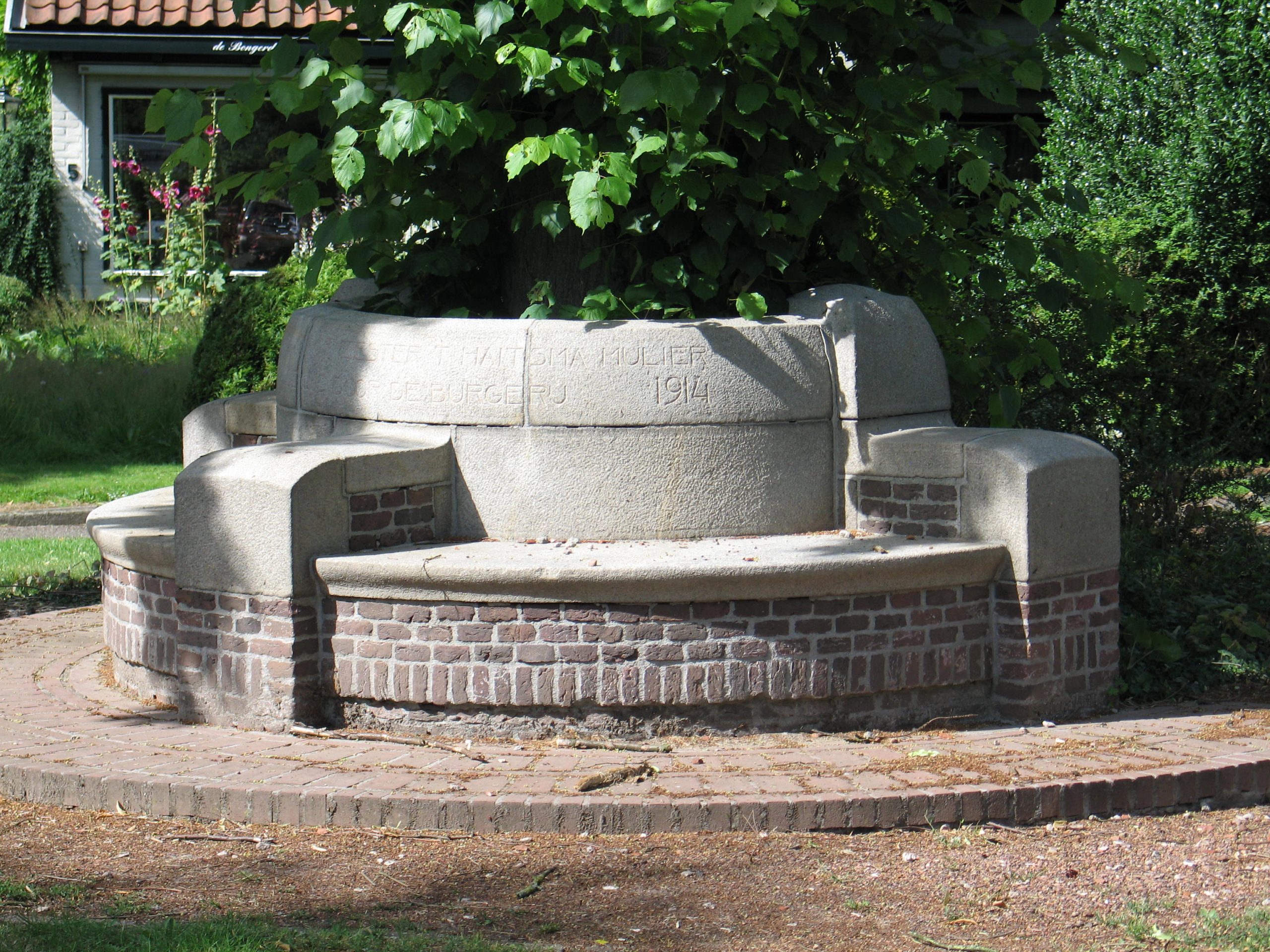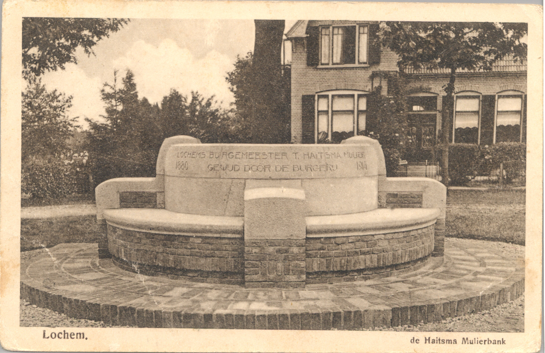 Aan de rand van het villapark Berkeloord, staat op een door villa’s omzoomd pleintje deze monumentale herinneringsbank. “Gewijd door de burgerij” staat er op te lezen, evenals de naam van de Lochemse burgemeester T. Haitsma Mulier en de jaartallen 1880 en 1914. Ruim 34 jaar was Tjepke Haitsma Mulier (1847-1921) burgemeester van de gemeente Lochem, toen hij in 1914 eervol van zijn taak als burgervader werd ontslagen. Op 10 februari 1880 was hij officieel aangetreden, het begin van een lang en succesvol burgemeesterschap. Onder de van oorsprong uit Friesland (Bolsward) afkomstige Haitsma Mulier zou Lochem zich verder ontwikkelen tot een bloeiende gemeente met tal van “moderne voorzieningen”. Het burgemeestersgezin bewoonde een prachtige, rond 1880 opgeleverde villa aan de Zwiepseweg, het monumentale Beau Regard, gelegen in een grote tuin, schuin tegenover de entree tot de Nieuweweg.